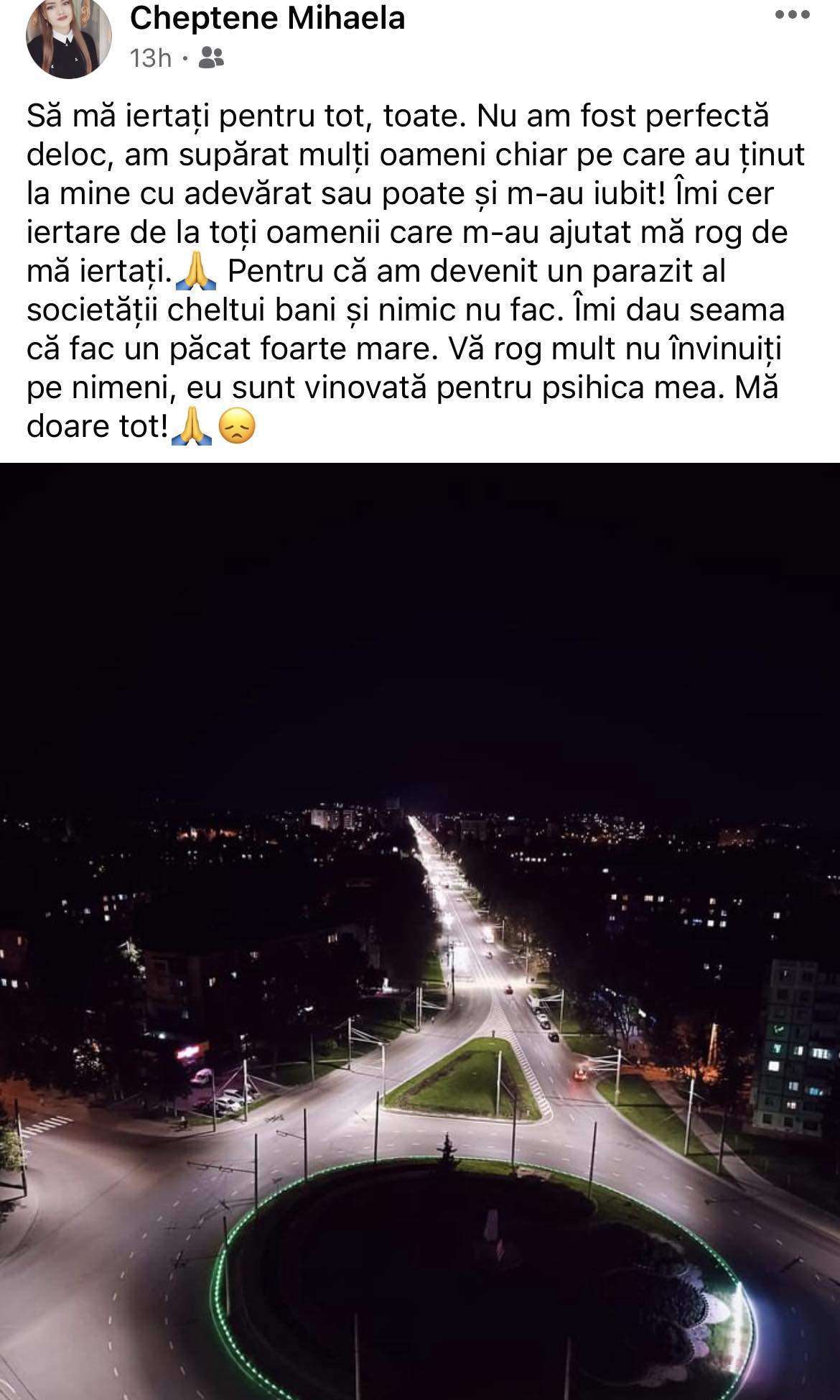 „Să mă iertați pentru tot, toate. Nu am fost perfectă deloc, am supărat mulți oameni care au ținut la mine cu adevărat sau poate și m-au iubit! Îmi cer iertare de la toți oamenii care m-au ajutat. Pentru că am devenit un parazit al societății cheltui bani și nimic nu fac. Îmi dau seama că fac un păcat foarte mare. Vă rog mult nu învinuiți pe nimeni, eu sunt vinovată. Mă doare tot”, a fost mesajul scris de tânără pe pagina sa de Facebook.