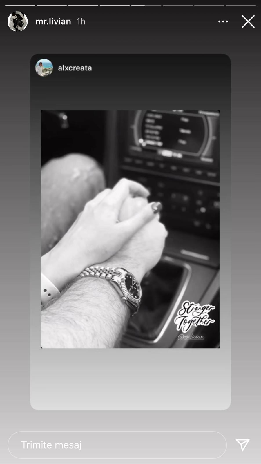 Alexandra și Livian au, se pare, o relație foarte frumoasă căci petrec timp împreună, după cum se poate observa din postările lor din mediul online. De data aceasta, Alexandra a postat, pe contul ei de Instagram, o fotografie romantică cu descrierea: ”Mai puternici împreună”. Livian n-a stat nicio secundă pe gânduri și a repostat imaginea pe contul lui de socializare, semn că acesta nu se ferește de ochii curioșilor.