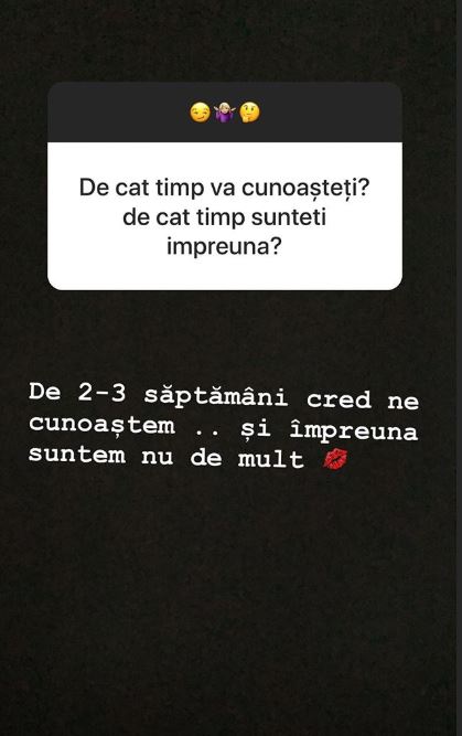 „Nu de mult, însă țin să precizez că de după ieșirea lui din emisiune”, a răspuns ea atunci când a fost întreabată de cât timp formează un cuplu cu el. „De două-trei săptămâni ne cunoaștem și împreună suntem nu de mult”, a mai spus ea.