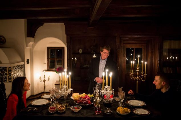 Oaspetii au avut permisiunea de a explora intregul castel, toate cele 57 de camere ale sale si „labirintul de coridoare iluminate cu felinare, ungherele infioratoare si scarile care scartaie”, dupa bunul lor plac. Cei doi au luat apoi cina la castel, printre mancarurile pregatite pentru ei numarandu-se tocana de pui cu paprika- acelasi preparat pe care Jonathan Harker, protagonistul romanului „Dracula”, il primeste in carte.