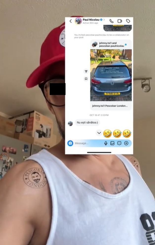 „Anuntați-l pe Pescobar că mi-am făcut tatuaj cu numele lui: Pescobar London! Încă nu știe, nu i-am spus, la fel ca și cu stickerele de pe mașină, a zis că nu sunt sănătos la cap. Dați-i tag în comentarii, să vedem ce părere are. Love”, a transmis tânărul respectiv, în clipul de pe TikTok.