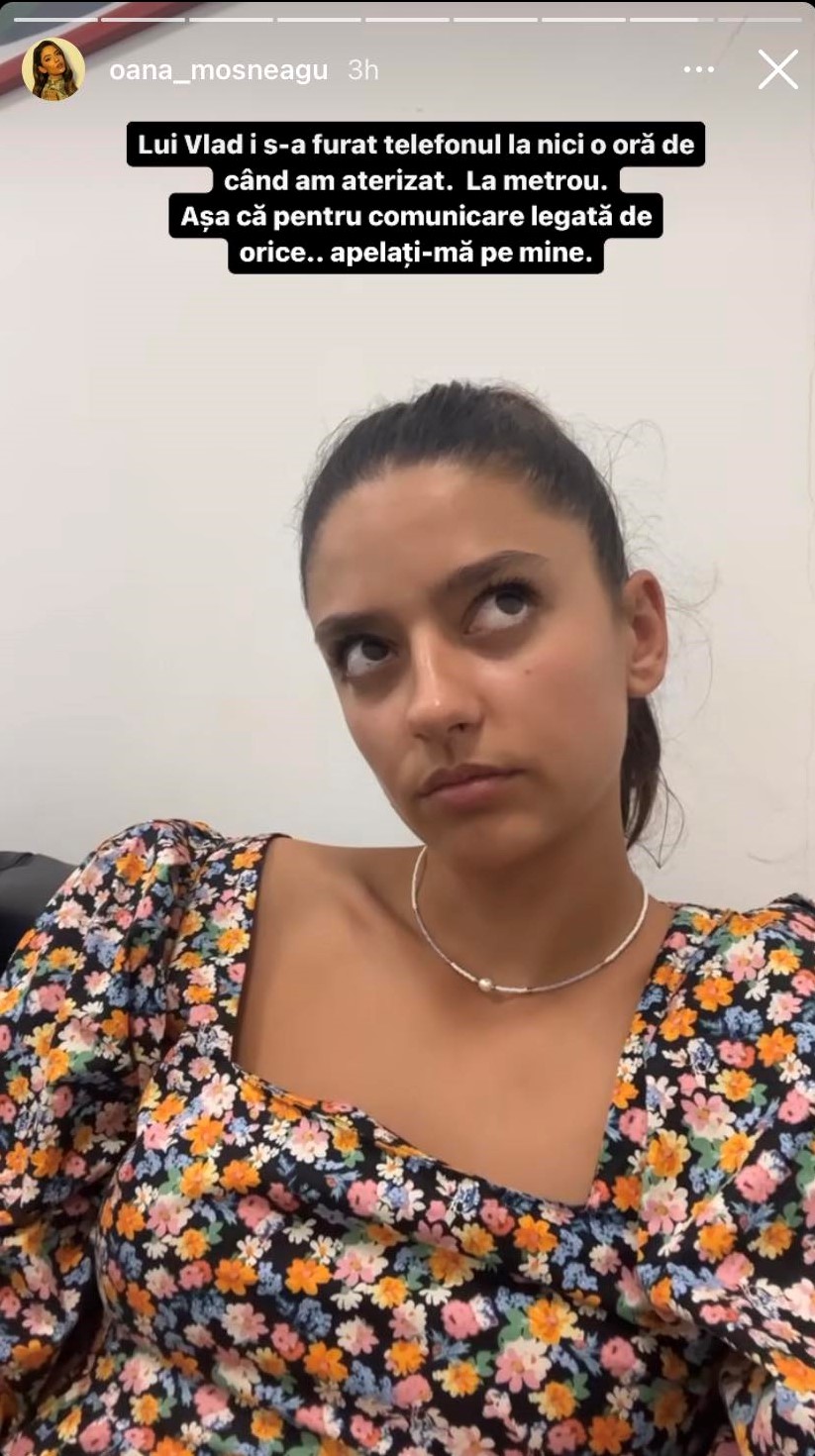 „Lui Vlad i s-a furat telefonul la nici o oră de când am aterizat. La metrou. Așa că pentru comunicare legată de orice... apelați-mă pe mine”, a scris Oana Moșneagu pe pagina ei de Instagram.
