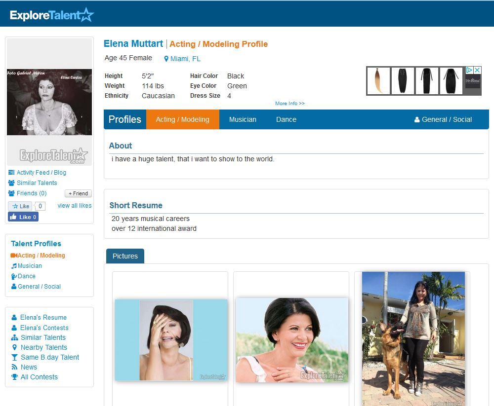 Românca îşi prezintă pe scurt realizările, menţionând că are în spate 20 de ani de carieră şi peste 12 premii internţionale. ”Am un talent uriaş pe care vreau să-l arăt lumii”, scrie Elena pe contul ei de pe exploretalent.com.