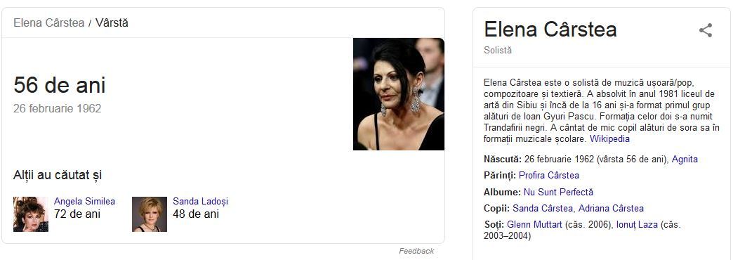 Elena Cârstea are profil pe o pagină de impresariat artistic din SUA în care apare cu 11 ani decât este în realitate. Cântăreaţa apare pe site ca având 45 de ani, când în realitate are 56 de ani.