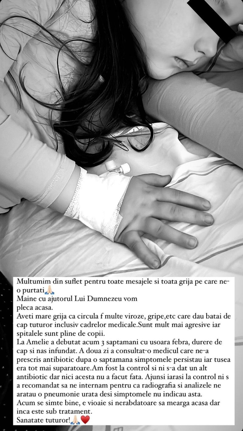 Elena Gheorghe a trecut printr-o perioadă delicată cu fiica ei, după ce aceasta s-a îmbolnăvit, iar de trei săptămâni artista se „luptă” să-și facă fata bine. A mers cu ea la mai mulți medici și a urmat mai multe tratamente, însă, în cele din urmă a fost nevoită să se interneze cu micuța în spital. Acum, Amelie a fost externată, se simte mai bine, dar este în continuare sub tratament. Vedeta a tras un semnal de alarmă pe rețelele de socializare și i-a îndemnat pe părinți să fie foarte atenți!