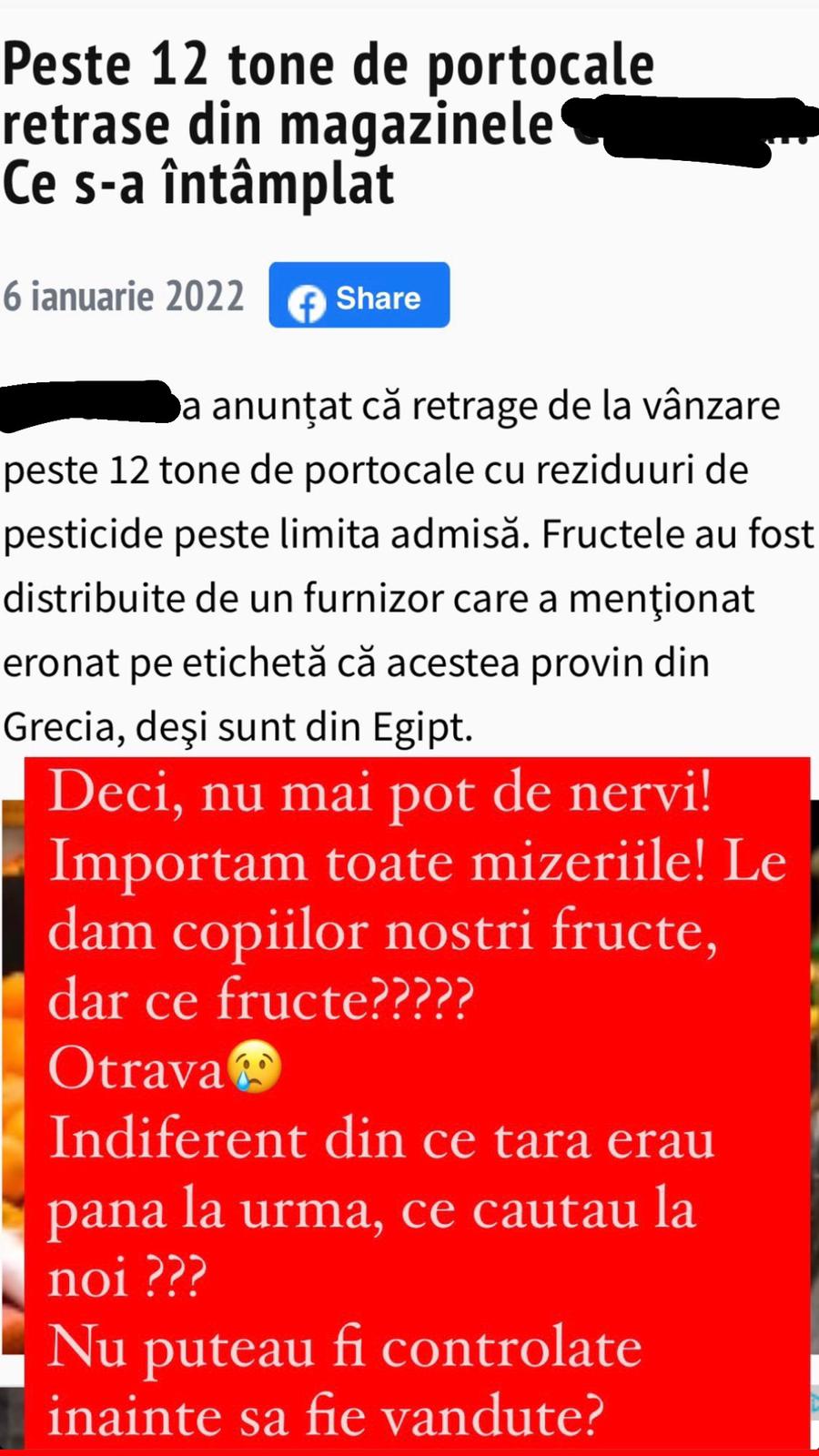 Unul dintre fanii ei, i-a mărturisit în privat, că și copiii lui au consumat citricele, iar din aceatsă cauză, cei mici au avut probleme de sănătate. De aici, Elena Gheorghe a răbufnit, trăgând din nou un semnal de alarmă asupra produselor comercializate pe piața română.