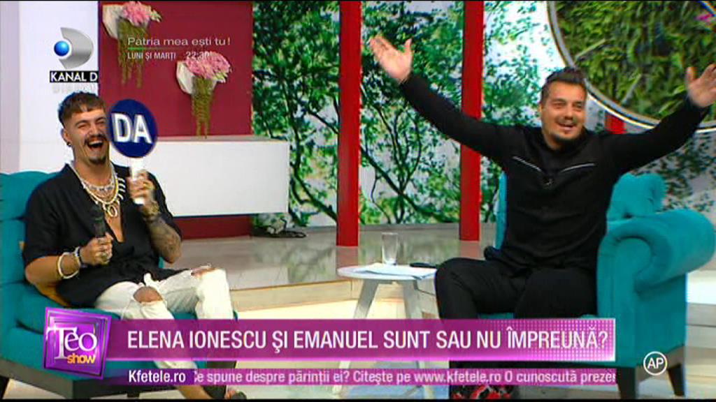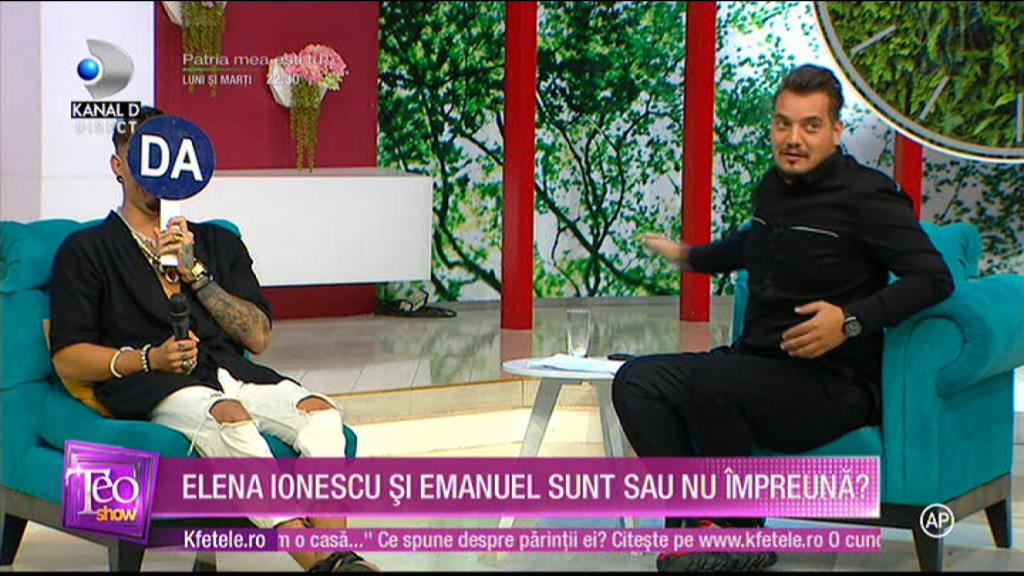 După ce și-au făcut o intrare de zile mari, Elena Ionescu și Emanuel au răspuns tuturor întrebărilor. „Se iubesc!”, a remarcat Bursucu, prezentatorul emisiunii. Cei doi au mărturisit că nu s-au mai văzut în ultima perioadă, încă de la filmările videoclipului pentru piesa „Noaptea Albă”, deoarece au fost foarte ocupați.
