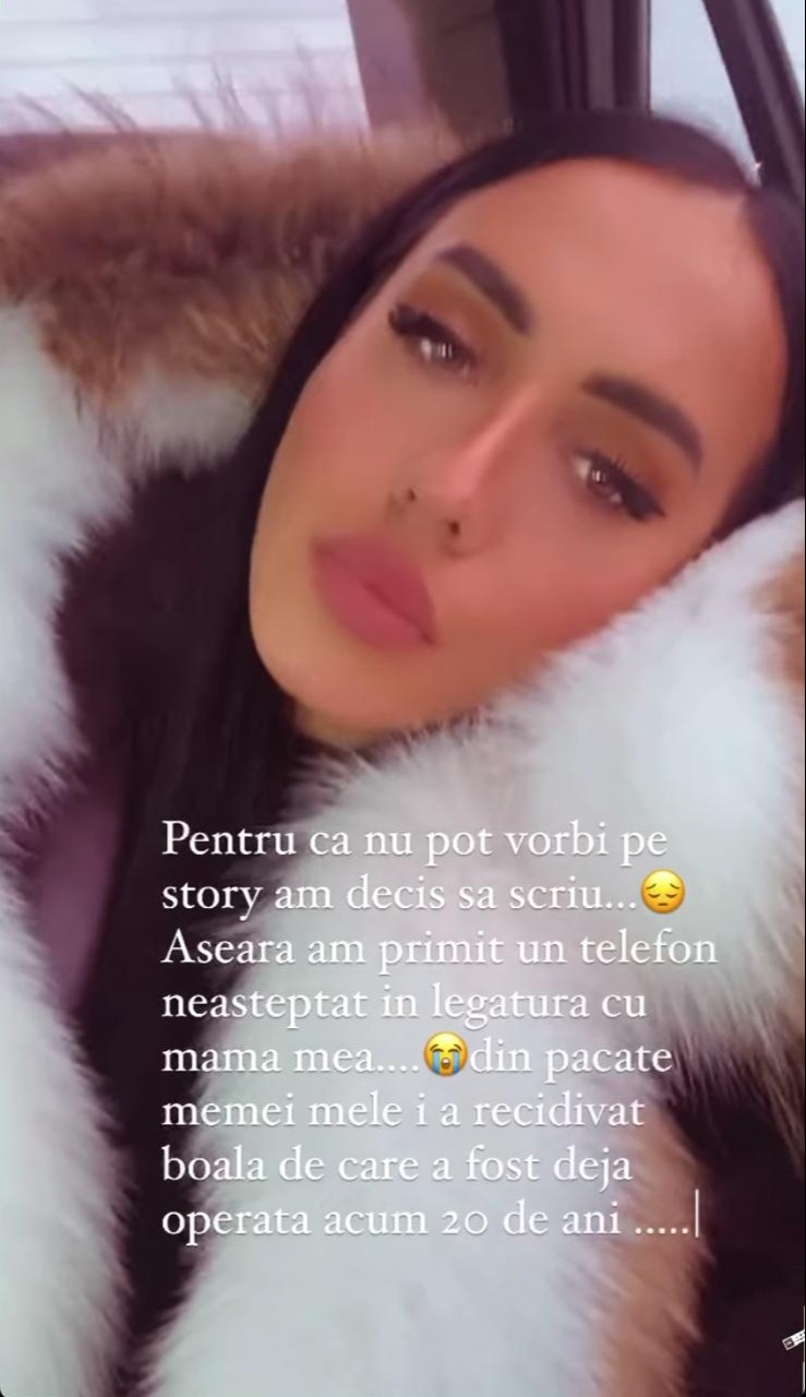 „Pentru că nu pot vorbi pe story am decis să scriu... Aseară am primit un telefon neașteptat în legătură cu mama mea... Din păcate, mamei mele i-a recidivat boala de care a fost deja operată acum 20 de ani...”, le-a transmis Ella urmăritorilor săi.