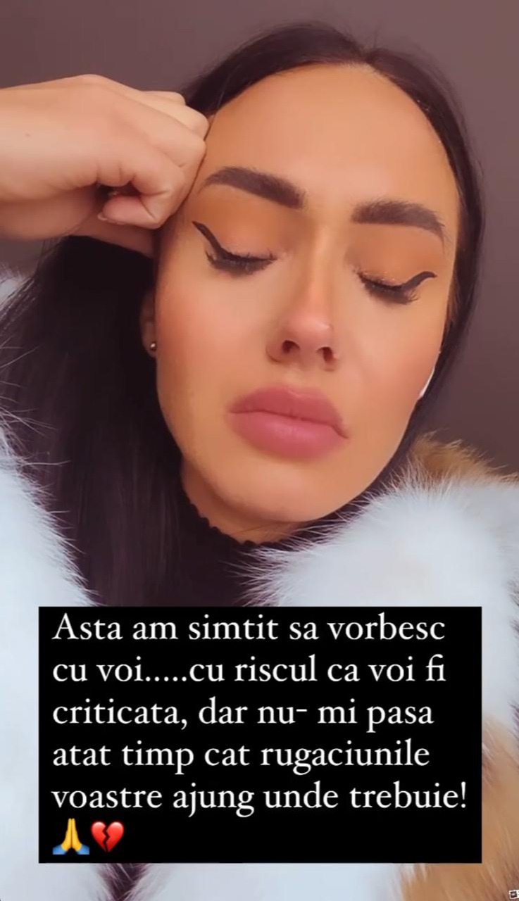 În încheiere, ea a transmis tuturor celor care o urmăresc să aibă grijă de sănătatea lor, mai presus decât orice. „Asta am simțit, să vorbesc cu voi... cu riscul că voi fi criticată, dar nu îmi pasă atât timp cât rugăciunile voastre ajung unde trebuie! P.S. Mergeți la control la timp, din dragoste pentru cei dragi! Nu mai fiți egoiști... banii se face și se pierd, dar sănătate cu greu...