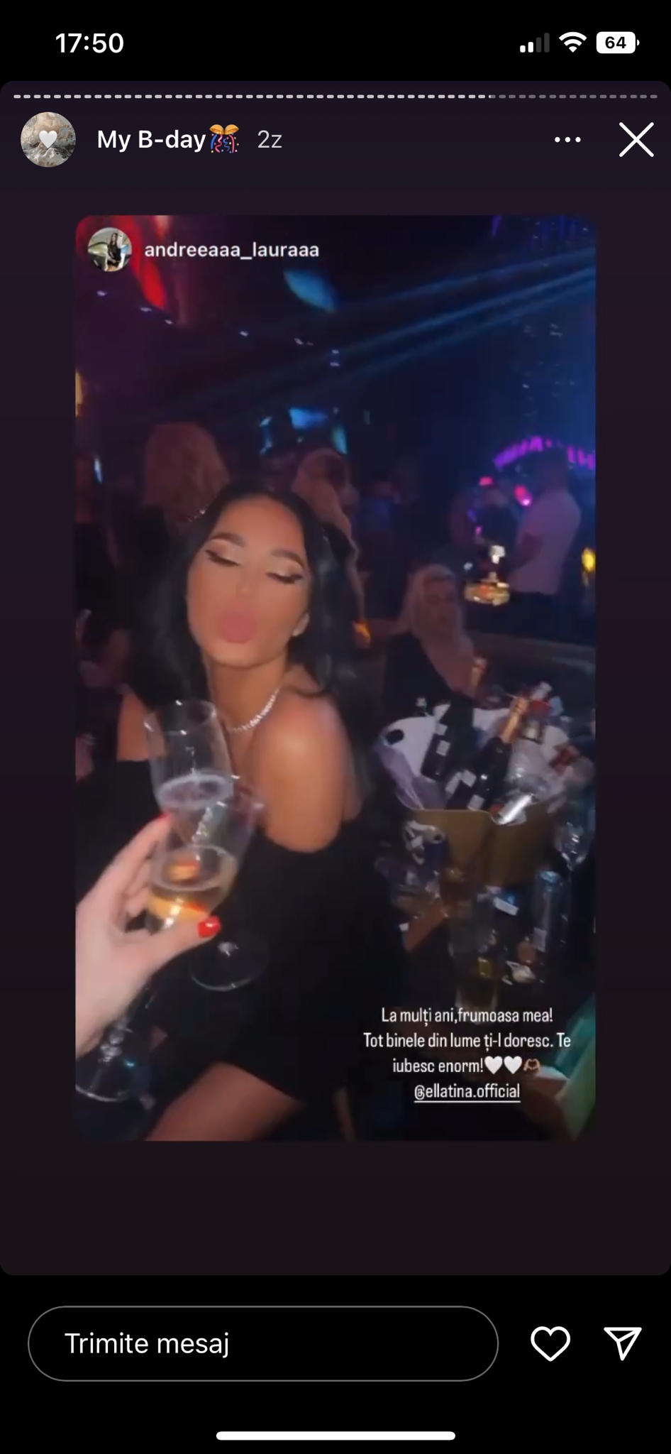 Aceasta a fost surprinsă de multe mesaje din partea urmăritorilor ei și a fost recunoscătoare pentru susținerea și aprecierea lor.„ Vă mulțumesc din suflet pentru absolut toate mesajele pe care ați început să mi le trimiteți. Vreau să precizez că astăzi nu este ziua mea de naștere, adică pe 7, ci ziua mea de nume, iar duminică, adică pe 8, este ziua mea de naștere. Una după alta, așa s-a nimerit. Prietenii mei au decis să mă surprindă într-un mod plăcut, evident. Chiar m-au surprins, eram pe la bucătărie, uitați-mi fața. Vă mulțumesc din suflet. Mi-ați creat foarte multă emoție deja și sufletul meu e inundat de emoții și foarte multe palpitații și vă mulțumesc din suflet. Vă iubesc și să puneți poze frumoase cu mine, cei care aveți de gând să postați.”, a transmis Ella Tina pe Instagram.