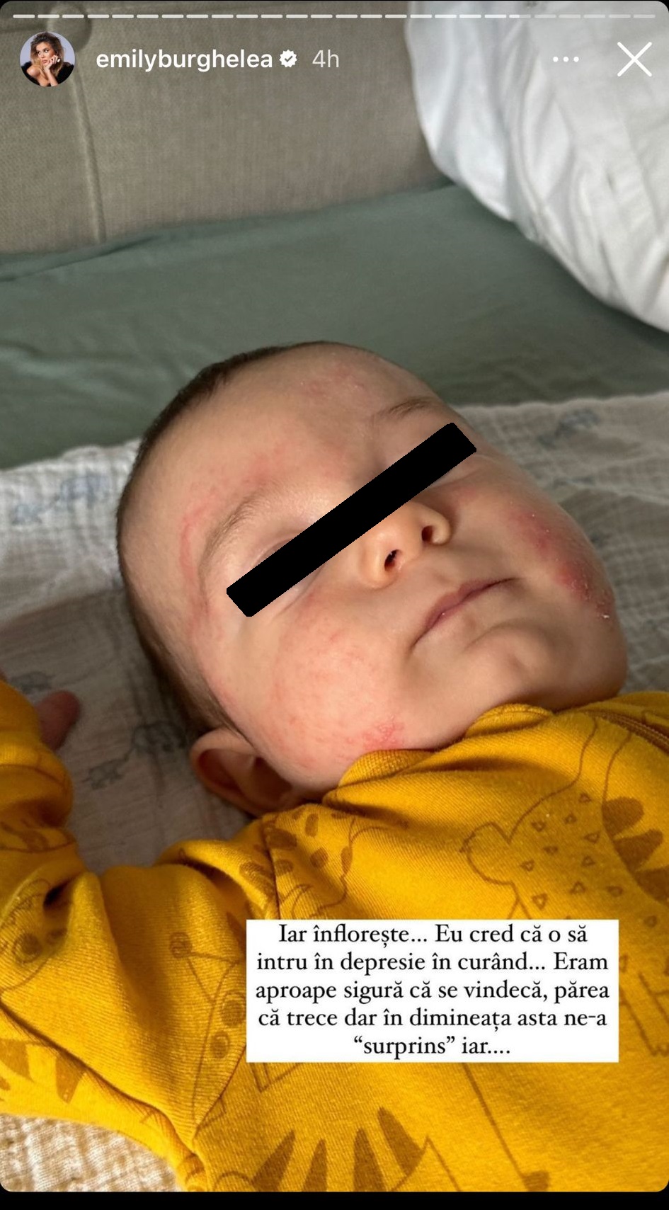 „Iar înflorește… Eu cred că o să intru în depresie în curând… Eram aproape sigură că se vindecă, părea că trece, dar în dimineața asta ne-a „surprins” iar…”, a mărturisit Emily Burghelea, pe pagina sa de Instagram, alături de o fotografie cu fața micuțului Damian.