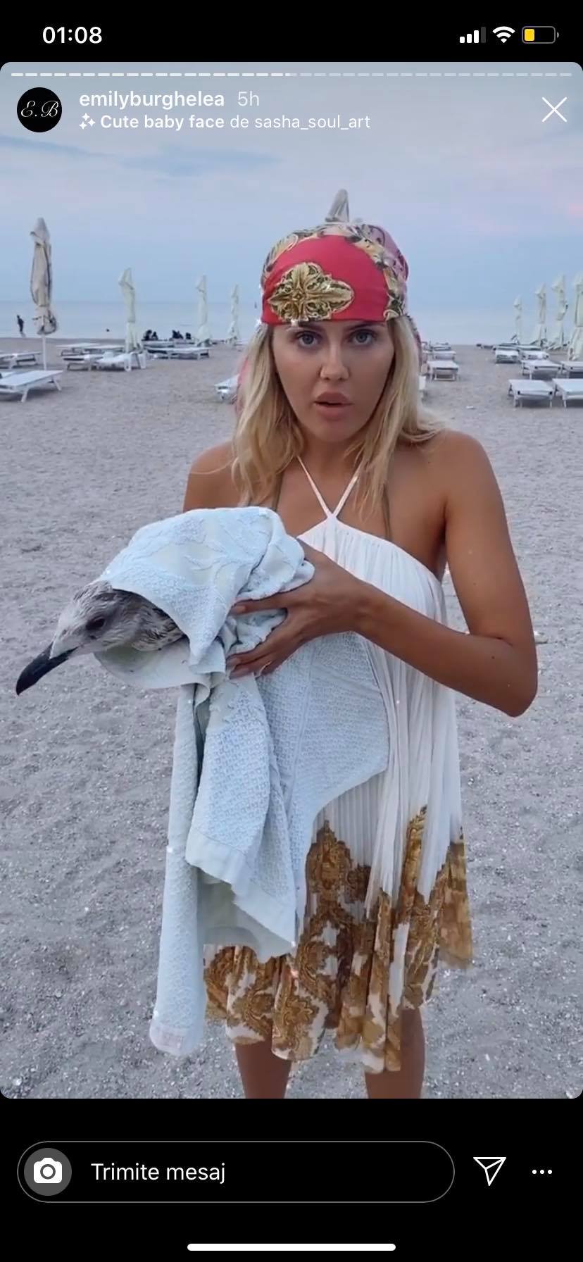 Nu vă spun că am încercat să-i dau de mâncare și conservă de ton și piept de pui, m-am dus să-i caut hamsii pentru că am văzut pe internet că pescărușii mănâncă hamsii, dar nu am găsit. Am văzut că mănâncă și scoici. M-am dus la un restaurant din Constanța și i-am luat scoici crude, dar nu vrea să mănânce. I-am băgat niste apă pe gât cu forța ca să se curețe”, a mai spus Emily Burghelea, aseară pe Instagram.