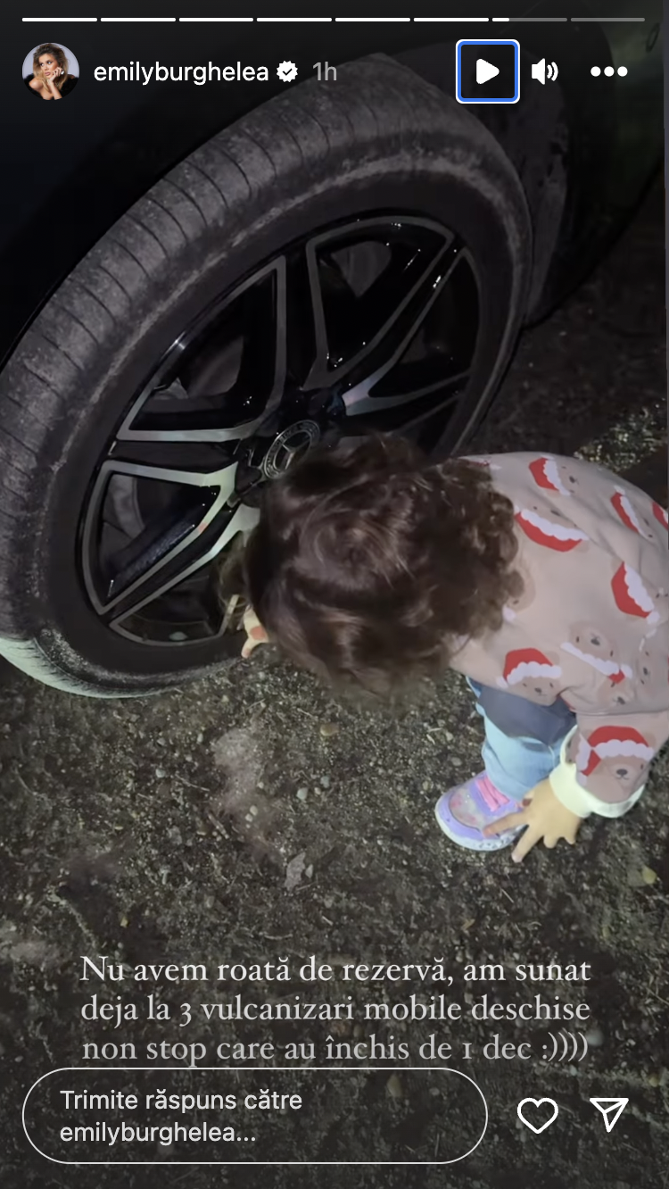 „Am luat o groapă de era să ne sară roata... ce e de făcut acum? E și 1 decembrie și suntem și lângă București. Nu avem roată de rezervă. Am sunat deja la 3 vulcanizări mobile deschise non-stop care au închis de 1 Decembrie”, a fost mesajul pe care Emily Burghelea l-a transmis în mediul online, în urmă cu puțin timp.