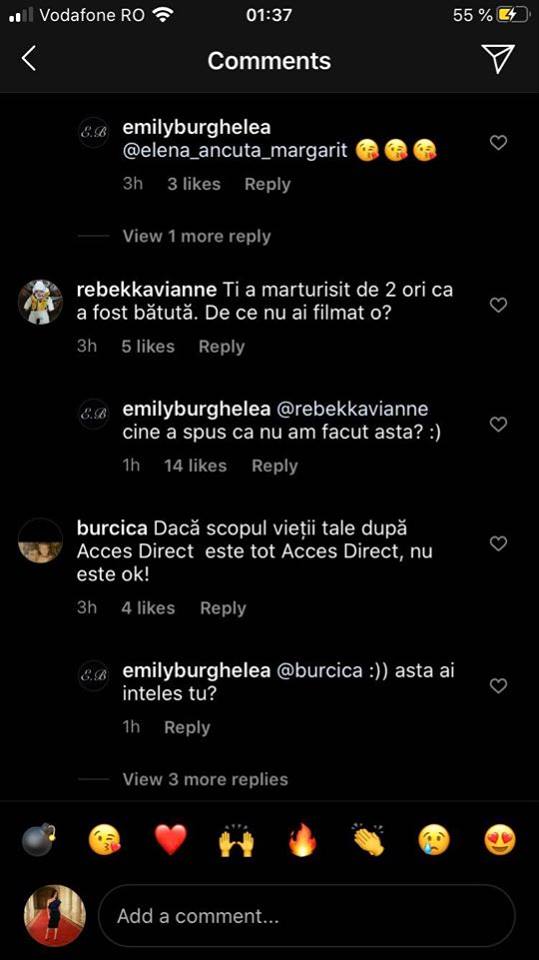 Acum, după ce a fost dată în judecată și așteaptă procesul în care este dispusă să demonstreze că are dreptate, Emily a făcut noi declarații absolut șocante pe rețelele de socializare, acolo unde a fost întrebată de un urmăritor de ce dacă Veronica i-a povestit de două ori că este agresată de Viorel, nu a filmat-o.