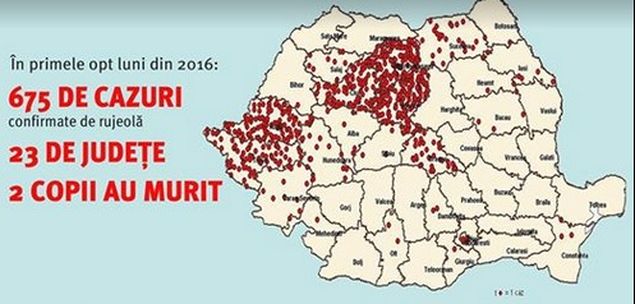 "În primele opt luni ale acestui an, România a înregistrat 675 de cazuri confirmate de rujeolă în 23 de judeţe. 2 copii au murit. Un al treilea deces suspect de rujeolă a fost înregistrat zilele trecute, dar aşteaptă confirmarea finală.