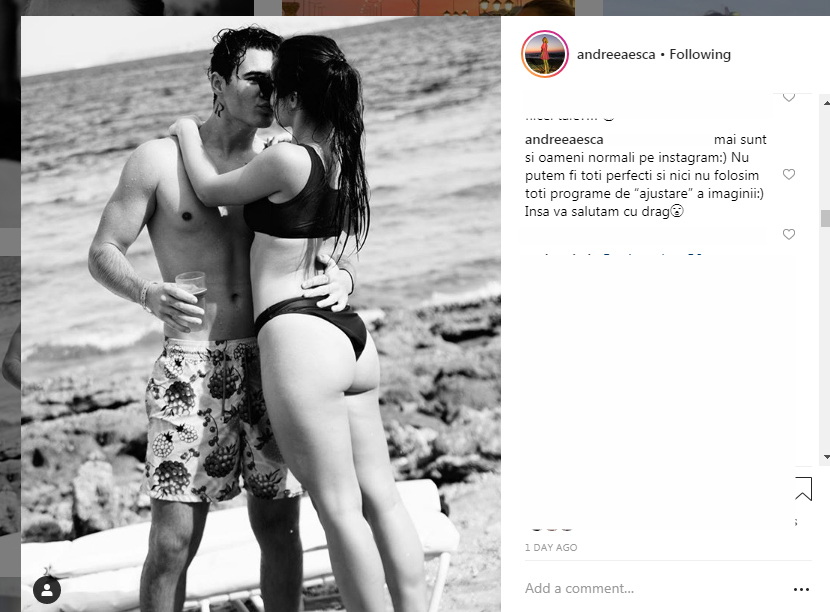 "Mai sunt şi oameni normali pe Instagram. Nu putem fi toţi perfecţi şi nici nu folosim toţi programe de 'ajustare' a imaginii. Însă vă salutăm cu drag", a răspuns Andreea Esca.