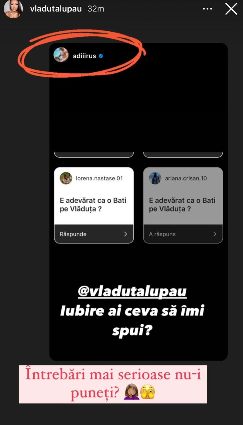 Două persoane care îi urmăresc activitatea de pe rețelele de socializare au pus o întrebare strigătoare la cer: „Este adevărat că o bați pe Vlăduța?”.Ei bine, sportivul a postat întrebările la InstaStory și a avut un mesaj pentru soția lui: „Iubire ai să-mi spui ceva?”. Vlăduța Lupău a reacționat și ea imediat și imediat a condamnat gestul celor doi internauți, cărora le-a bătut obrazul: „Întrebări mai serioase nu-i puneți?” .
