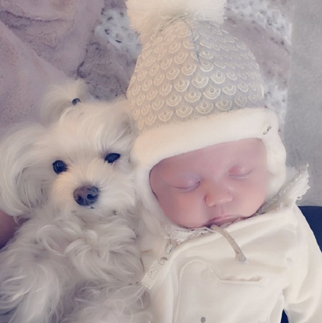 In cea mai recenta fotografie, fetita doarme linistita, alaturi de catelusa Bella, iar hainutele ei se asorteaza nu doar cu blana catelusei, dar si cu asternuturile.