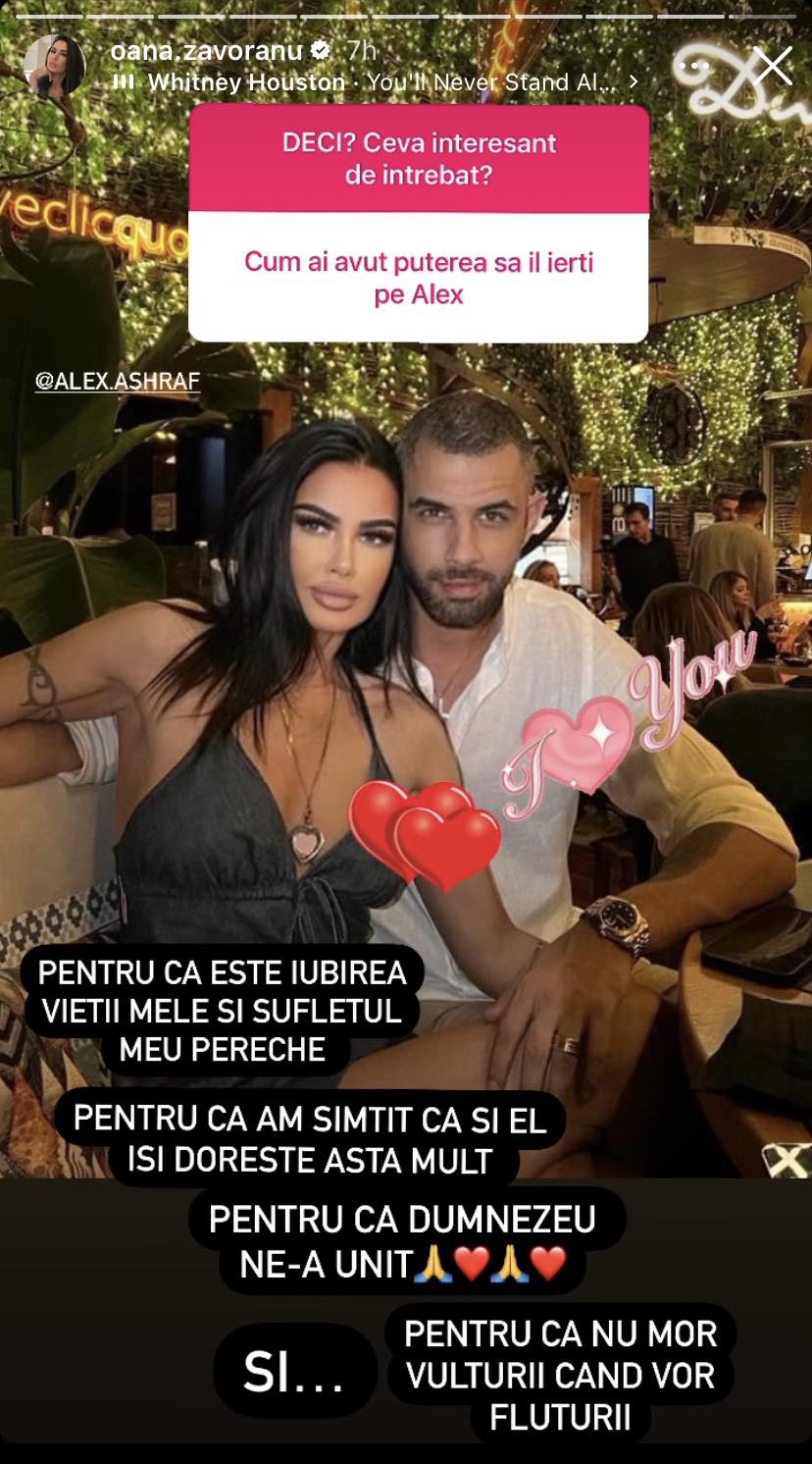 La ceva timp după marea împăcare, Oana Zăvoranu a spus tot adevărul despre relația ei și a lui Alex Ashraf, dezvăluind motivele care au făcut-o să îl ierte pe bărbat pentru infidelitate. Întrebată fiind de fanii ei din mediul online cum și-a găsit puterea de a-i oferi o nouă șansă soțului ei, Oana a mărturisit că Alex Ashraf este iubirea vieții ei și a decis să îl ierte atunci când și-a dat seama că și el își dorește enorm să continue căsnicia cu ea.
