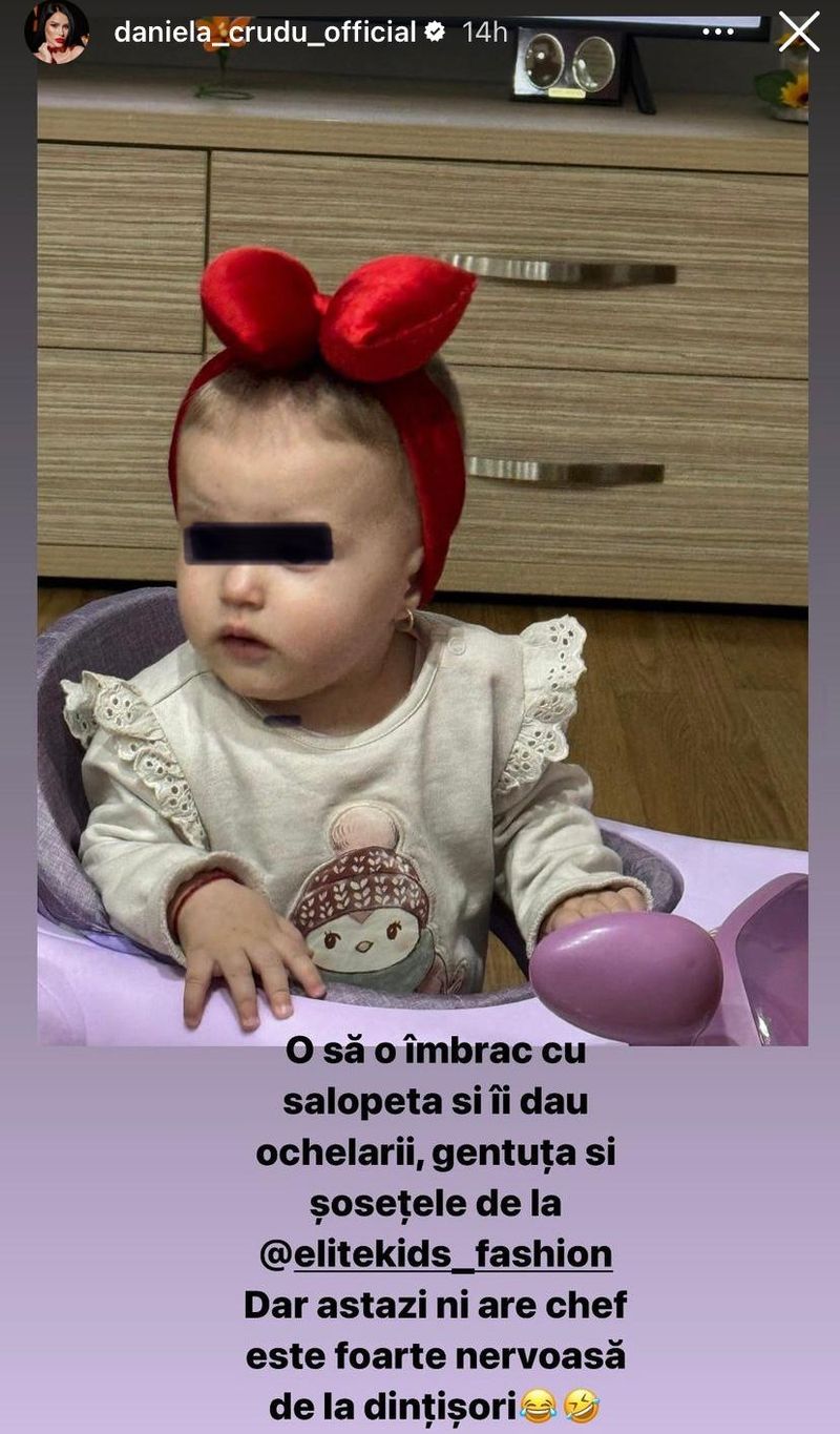 Cu puțin timp în urmă, Daniela Crudu a postat o serie de imagini pe Instagram cu fiica ei, în ipostaze diferite, dar adorabile, inclusiv atunci când micuța se afla într-un moment în care plângea de mama focului. În dreptul imaginii, tânăra mămică a scris și motivul pentru care fiica ei nu se află într-o dispoziție tocmai bună, anume din pricina dințișorilor, care încep să apară.