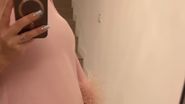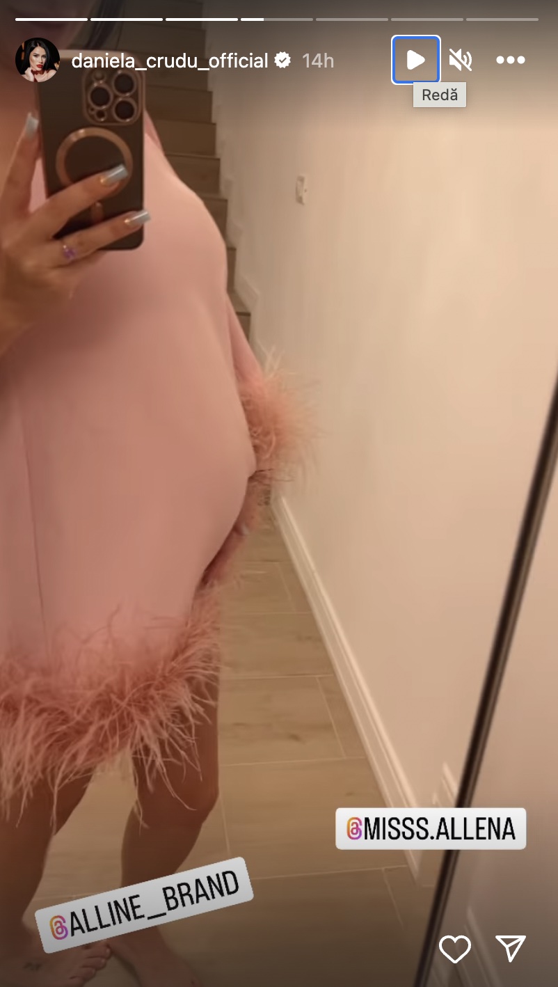 „Ce drăguță e! Chiar nu mi se vede burtica, că e oversized și, bine, asta merge și după ce o să nasc. Este superbă, iar rozul ăsta pudrat îmi place mult!”, a spus Daniela Crudu în mediul online, în timp ce se admira în oglindă.