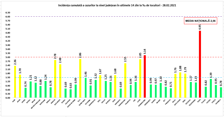 România a raportat, în ultimele 24 de ore, 2.830 cazuri noi de persoane infectate cu SARS–CoV–2 ,acestea fiind cazuri care nu au mai avut anterior un test pozitiv. Până astăzi, 28 februarie, pe teritoriul României, au fost confirmate 801.994 de cazuri de persoane infectate cu noul coronavirus, iar 740.352 de pacienți au fost declarați vindecați.