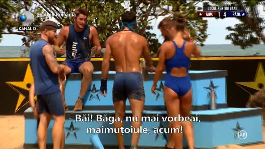 "Vorbeşte, bă, frumos!" şi-a început tirada Giani la adresa lui Iulian. Se pare că după ce a obţinut punctul Iulian a spus ceva care l-a deranjat pe antrenorul Faimoşilor. "Băga, nu mai vorbeai, maimuţoiule, acum", a continuat Giani.