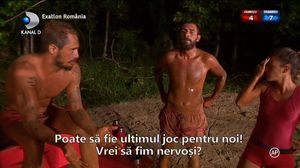 "E chiar nostim! Alergam prin noroi, e distractiv! Nu va agitati...Poate sa fie ultimul joc pentru noi, vreti sa fim nervosi?", le-a spus Vladimir, in ciuda faptului ca disperarea se putea citi pe chipul Larisei si al lui Catalin!