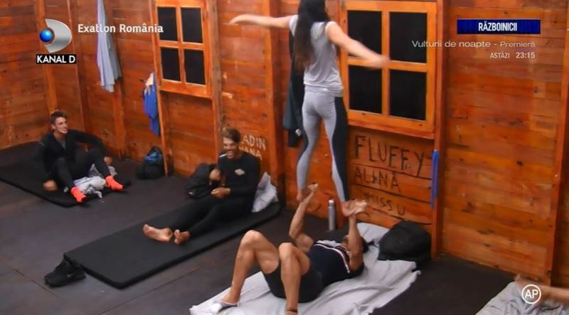 Silasi si Iulian radeau in timp ce Simi facea eforturi pentru a reusi sa nu se prabuseasca la podea. In momentul in care ea s-a sprijinit de perete si a fost aproape sa cada, toti Razboincii au izbuncit in ras. La un moment dat Simi a reusit sa urce pe palmele lui Alin.