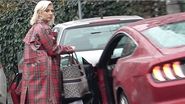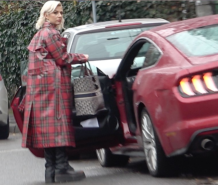 Nici în privința stilului vestimentar nu s-a lăsat mai prejos și a abordat o ținută fashion, parcă ruptă de pe străzile Londrei. Aceasta a fost surprinsă purtând o bluză neagră și o pereche de pantaloni de piele, pe deasupra, fiind îmbrăcată cu un superb trench în carouri, care se asorta de minune cu mașina pe care o conduce.
