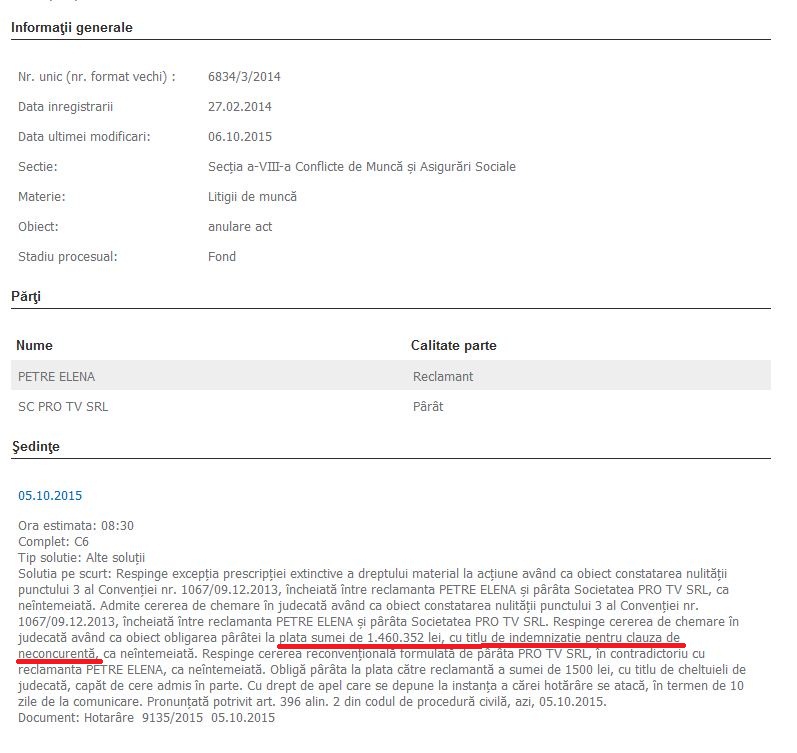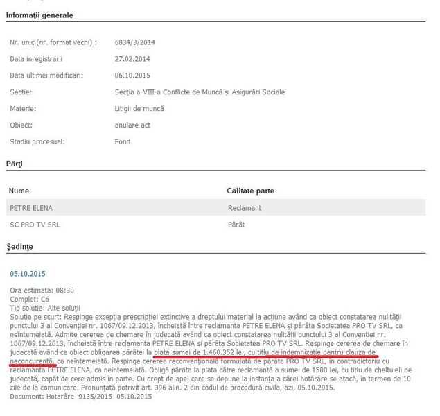 Cazul Elenei Petre nu este insa singular. In august, 13 fosti angajati au cerut executarea silita a firmei care detine postul de televiziune si care trebuia sa le plateasca peste 470.000 de lei pentru sporuri de noapte in perioada 2008-2011. De asemenea, Doina Gradea, fosta asistenta personala a lui Adrian Sarbu (care a recunoscut ca avea salariul mai mare decat al multor vedete din trust) a deschis un litigiu de munca si la fel si George Negrila, fost director de imagine, cu trei actiuni in instanta impotriva fostului angajator.