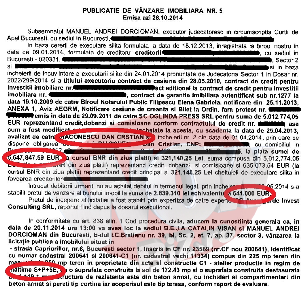 In 2009, DD a contractat doua credite in valoare totala de peste 5 milioane de euro, insa socotelile in politica si televiziune nu s-au potrivit cu realitatea. Diaconescu nu a putut sa-si plateasca ratele, iar executorii judecatoresti i-au scos deja la vanzare un bloc pe care acesta il are in zona Floreasca din Bucuresti.