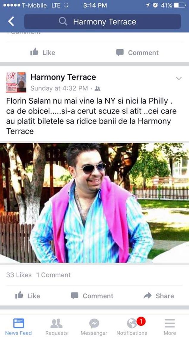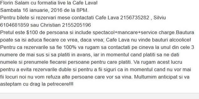 Vineri seara, cantaretul ar fi trebuit sa cante la Philadelphia, in Cafe Lava, in fata a peste 200 de romani, care platisera 100 de dolari in avans pentru a-l vedea live. In acesti bani intra si consumatia, cu exceptia bauturilor, pe care localul respectiv nu le comercializeaza. Florin si-a petrecut Sarbatorile cu Roxana in Florida