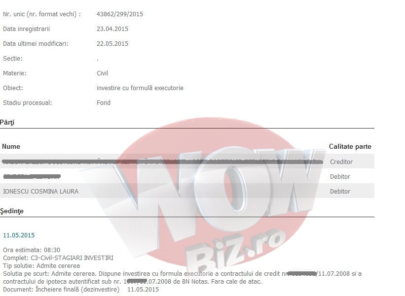 Alaturi de fostul ei sot, Cosmina a mai pierdut la Judecatoria Sectorului 1, pe 11 mai anul curent, un proces similar, prin care executorul judecatoresc a avut castig de cauza:
