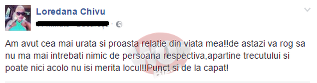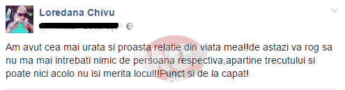 Ea a scris totusi si pe unul din conturile ei de socializare ca a incheiat relatia “urata si proasta”: “Am avut cea mai urata si proasta relatie din viata mea!! de astazi va rog sa nu ma mai intrebati nimic de persoana respectiva, apartine trecutului si poate nici acolo nu-si merita locul! Punct si de la capat!”, a scris ea.