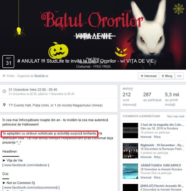 Descrierea petrecereii de Halloween pare azi, dupa tot ce s-a intamplat, o gluma macabra. „Pe 31 octombrie, lasa frica deoparte si vino sa pasesti in intuneric! Am pregatit o petrecere plina cu surprize terifiante, otravuri sofisticate si un concert Vita de Vie care iti va da fiori pe sira spinarii! Vei fi blestemat la distractie la cea mai autentica petrecere de Halloween din Capitala”, scriau organizatorii pe pagina de Facebook a evenimentului.
