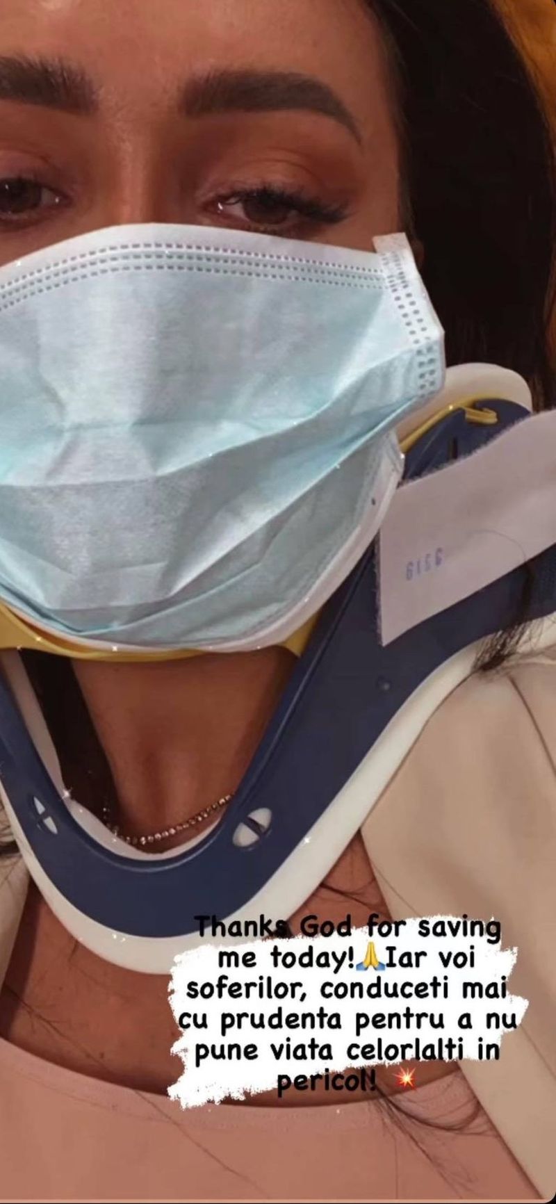 Ella a făcut accident, iar de vină a fost celălalt șofer, care, din spusele brunetei, nu ar fi acordat prioritate și a intrat în botul bolidului pe care îl conducea. Tânăra nu a da detalii și despre cum se simte, dar în poza pe care a postat-o la InstaStory după accident, îi mulțumea divinității că scăpat-o cu viață și pare că a primit îngrijiri din partea medicilor, căci în jurul gâtului are atașat un guler cervical.