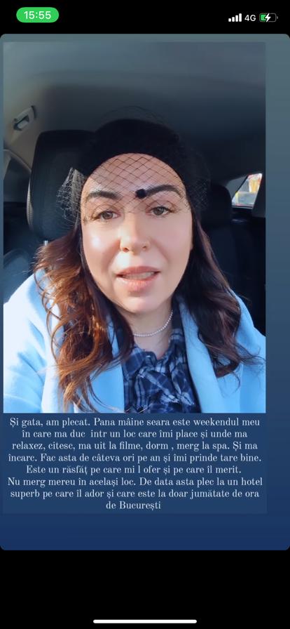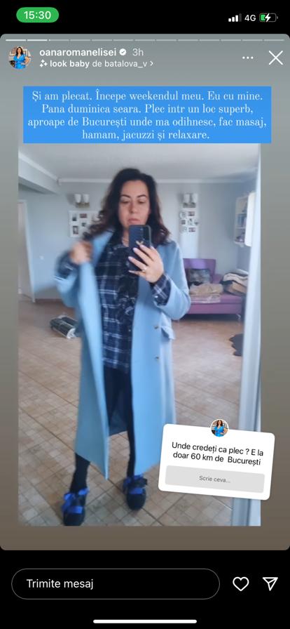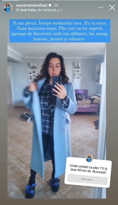 „Și am plecat. Începe weekendul meu. Eu cu mine. Până duminică seara. Plec într-un loc superb, aproape de București, unde mă odihnesc, fac masaj hamam, jacuzzi și relaxare. Până mâine seară este weekendul meu în care mă duc într-un loc care îmi place și unde mă relaxez, citesc, mă uit la filme, dorm, merg la spa. Și mă încarc. Fac asta de câteva ori pe an și îmi prinde tare bine. Este un răsfăț pe care mi-l ofer și pe care îl merit. Nu merg mereu în același loc. De data asta plec la un hotel superb pe care îl ador și care este la doar jumătate de ora de București.”, a spus Oana Roman pe Instagram.