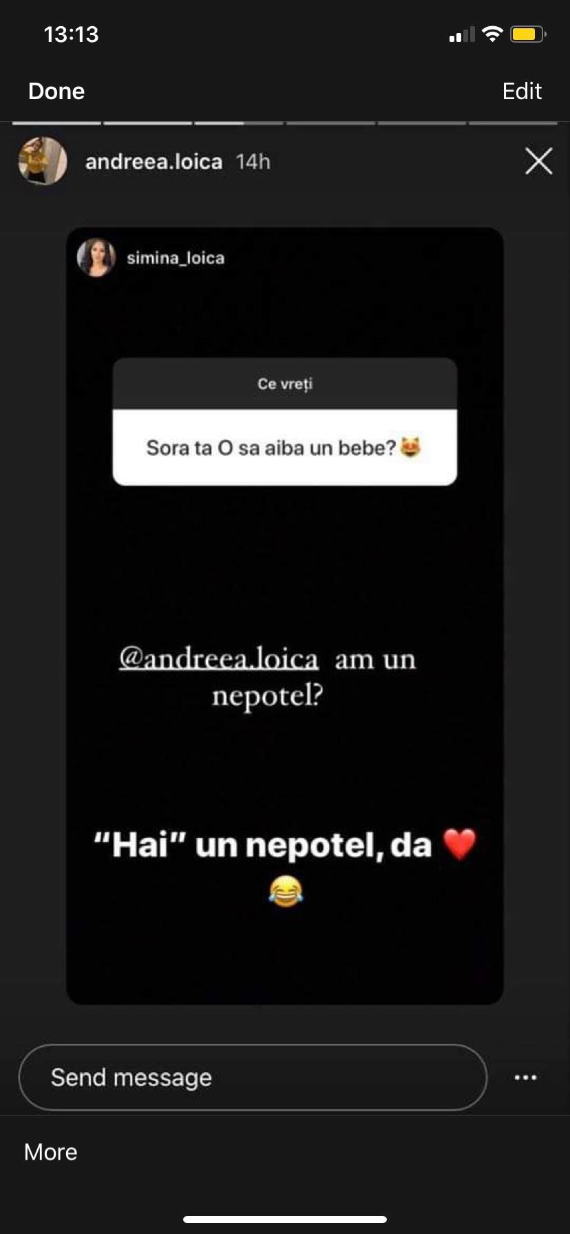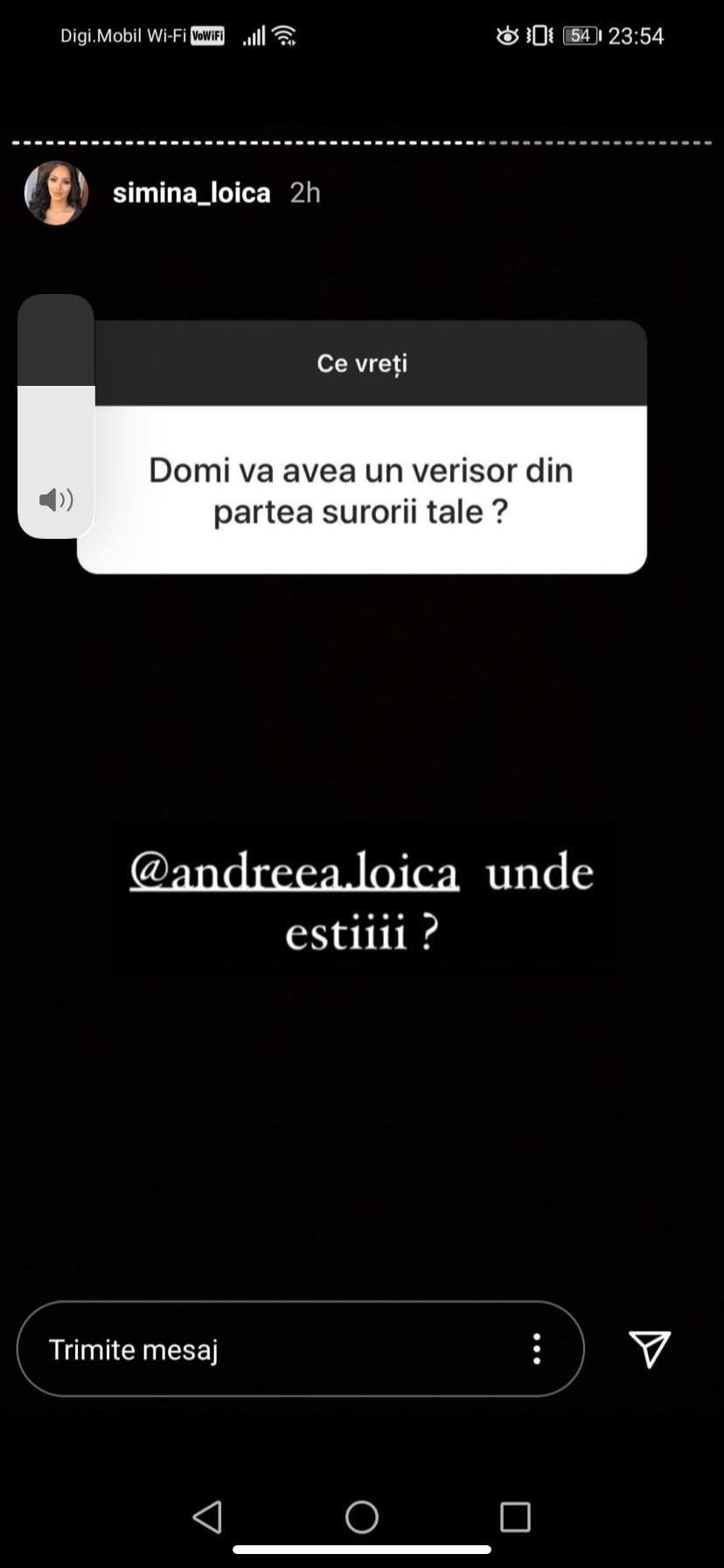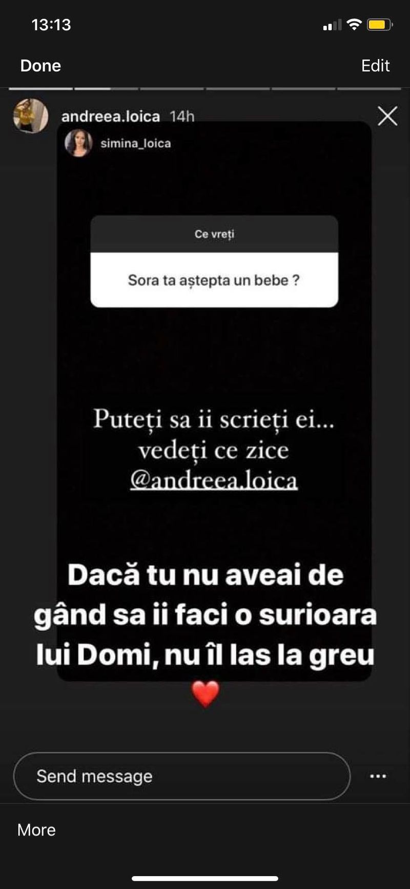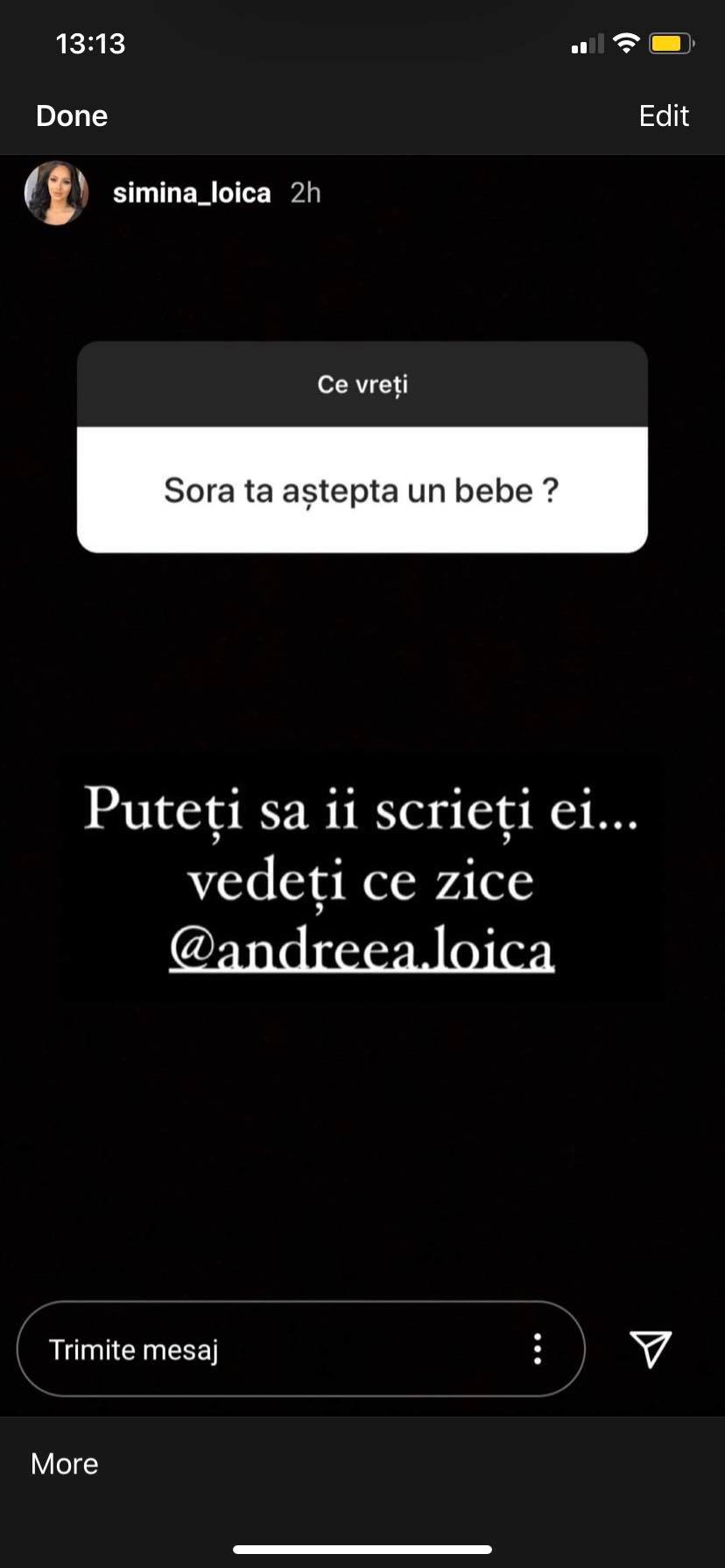 În secțiunea de întrebări de pe Instagram, fanii au întrebat-o pe Simina dacă sora ei va deveni mamă. Simina nu a vrut să vorbească în numele ei și i-a dat pasa direct Andreei Loica care a răspuns și a zis că da, îi va face un verișor lui Dominic.
