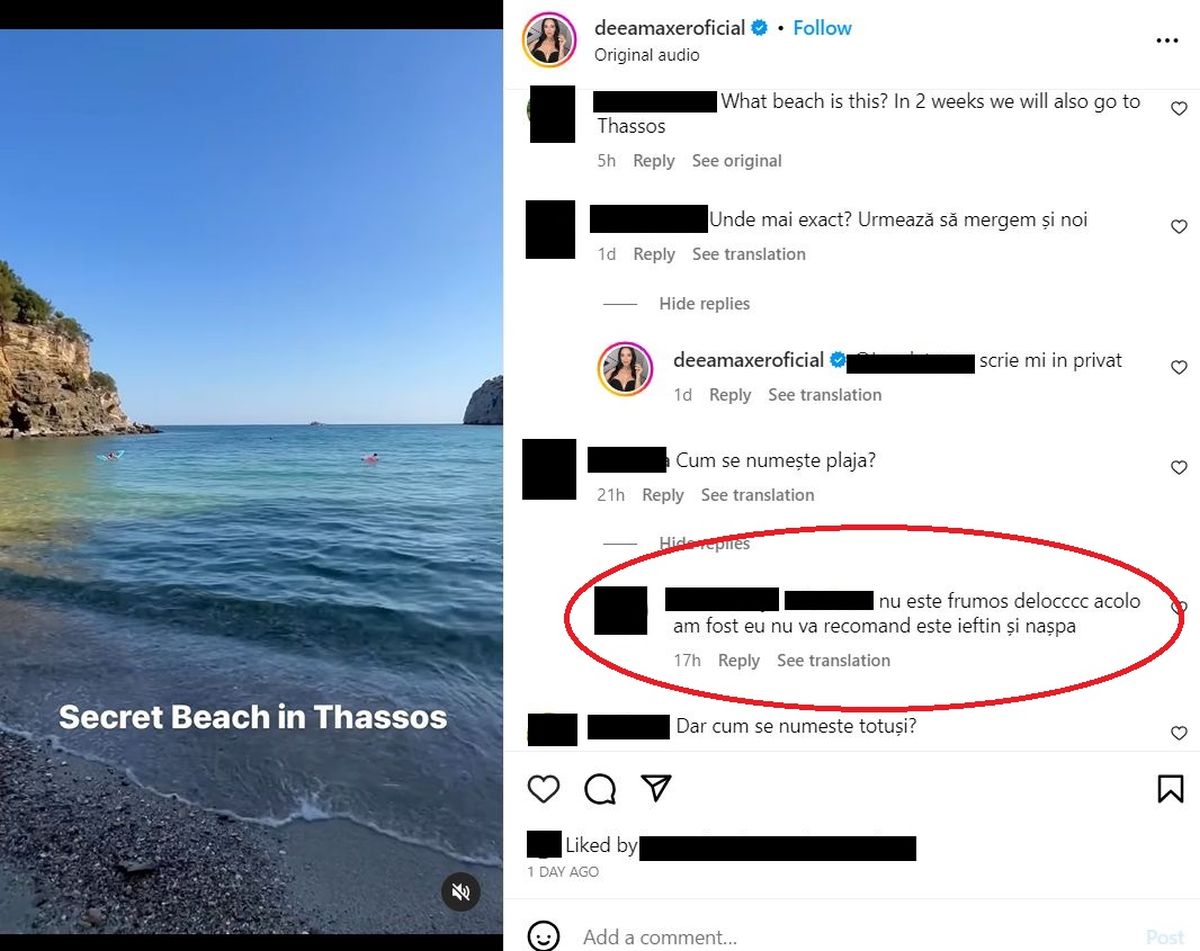 Deși vedeta a primit sute de like-uri, au apărut și fanii cărora s-ar putea să nu le convină nimic. Așa s-a întâmplat și la ultima postare a Deei, acolo unde o internaută susținea că destinația nu ar fi nici pe departe așa de frumoasă pe cât ar susține fosta soție a lui Dinu Maxer.