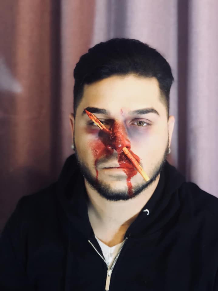 Dinte și-a băgat atunci prietenii în sperieți după ce a apărut la o petrecere plin de sânge și cu o creangă care părea să-i fi străpuns nasul. Masca era atât de bine realizată încât puteai să juri că tânărul chiar este rănit. Din fericire, la vremea respectivă nu a fost cazul, fiind evident că este vorba de o farsă. Acum, însă, lucrurile sunt mult mai complicate.