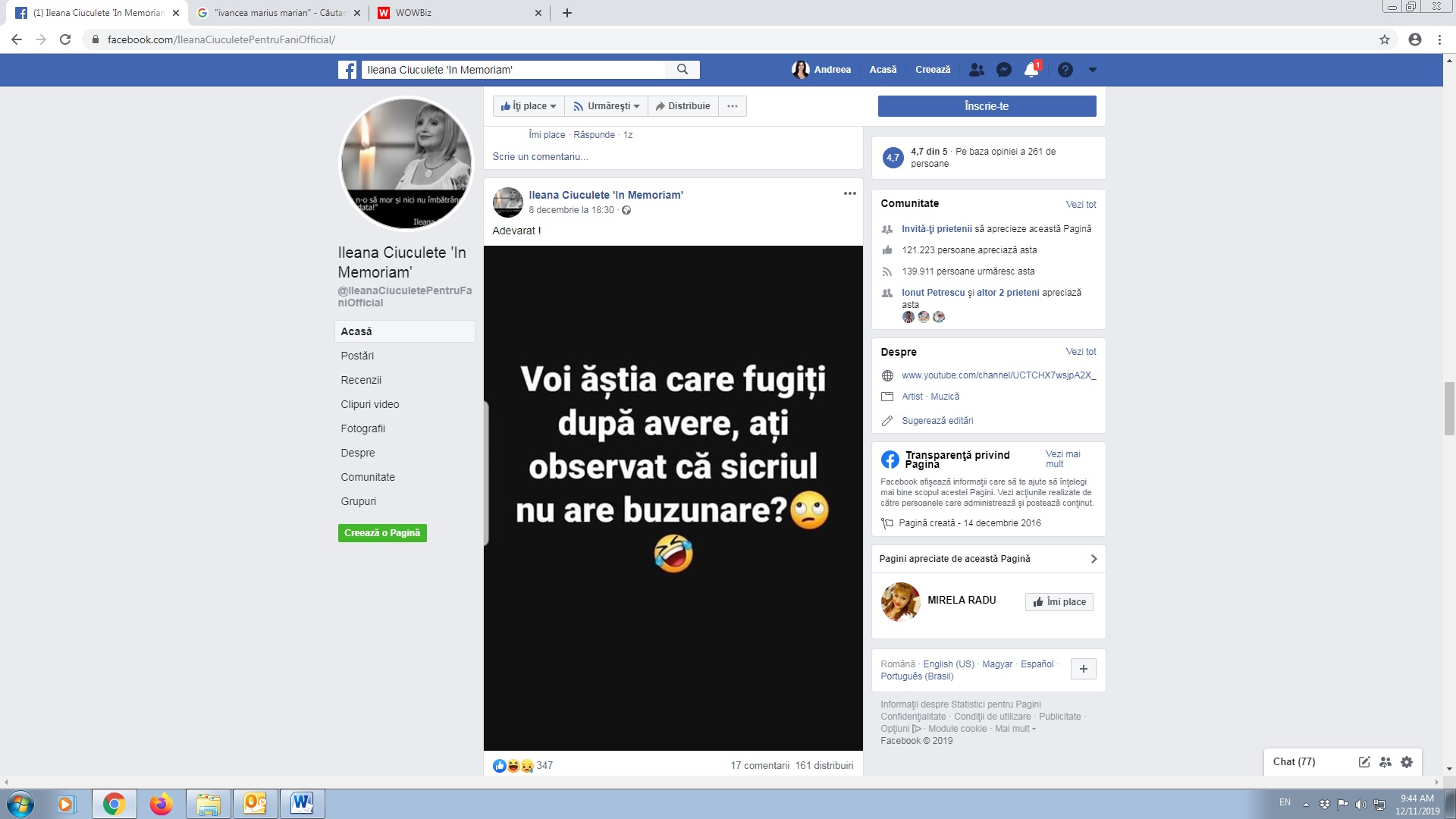 Pe lângă pagina personală de facebook, Codruţa mai administrează şi pagina „Ileana Ciuculete in Memoriam”, creată după decesul cântăreţei. În ultimii ani, Codruţa a postat fotografii şi filmări de arhivă cu Ileana Ciuculete. Acum câteva zile, pe pagina administrată de Codruţa a fost distribuit mesajul “Voi ăştia care fugiţi după avere, aţi observat că sicriul nu are buzunare?”.