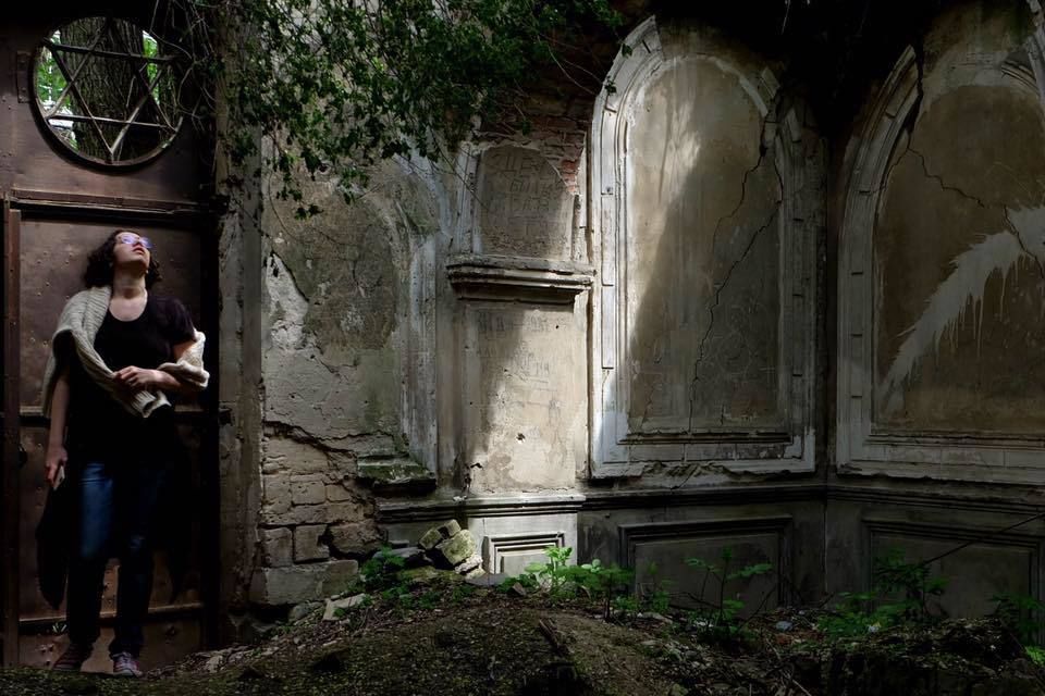 Fiica Maiei Morgenstern a intrat intr-o capela parasita, cu zidurile scorojite si cu un acoperis rupt, prin care intra o fasie de lumina, fiind fotografiata in timp ce se uita spre cer.