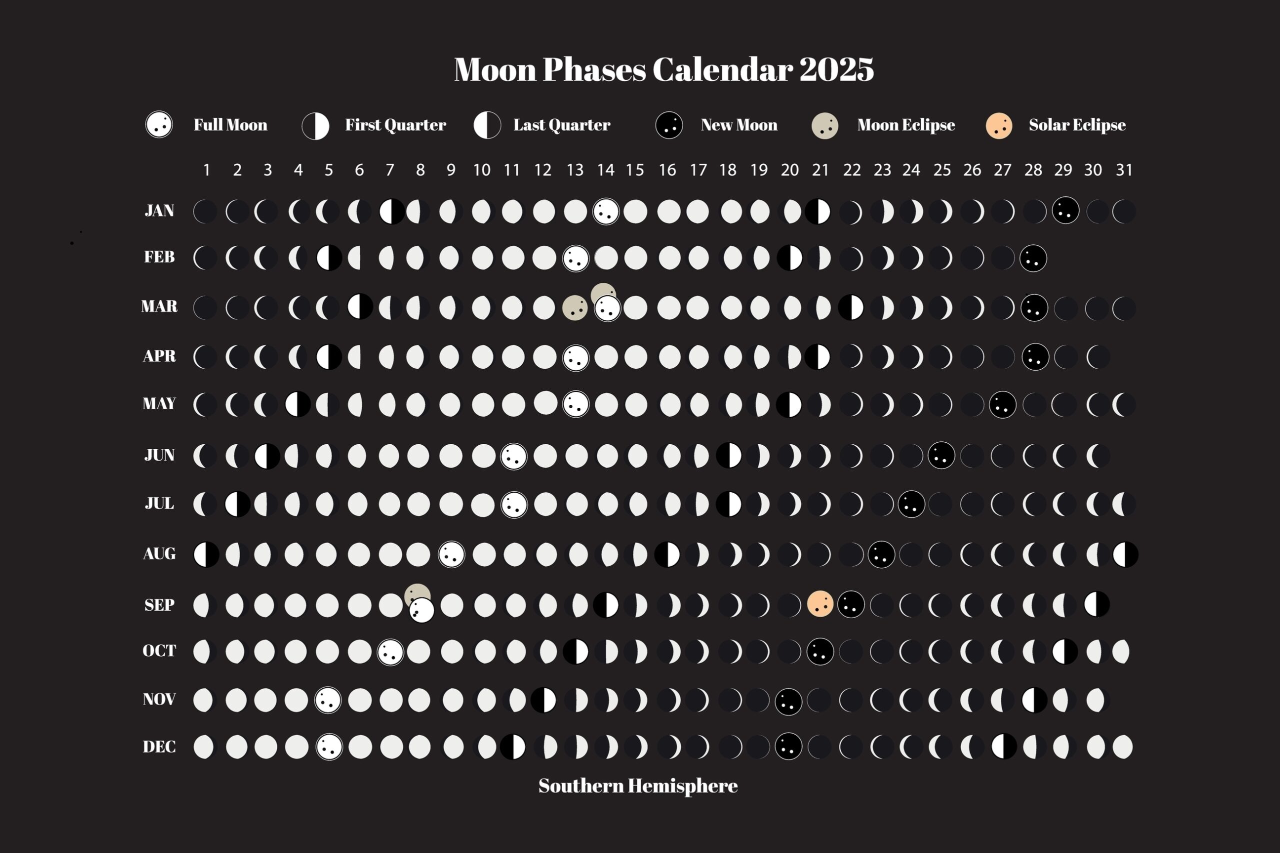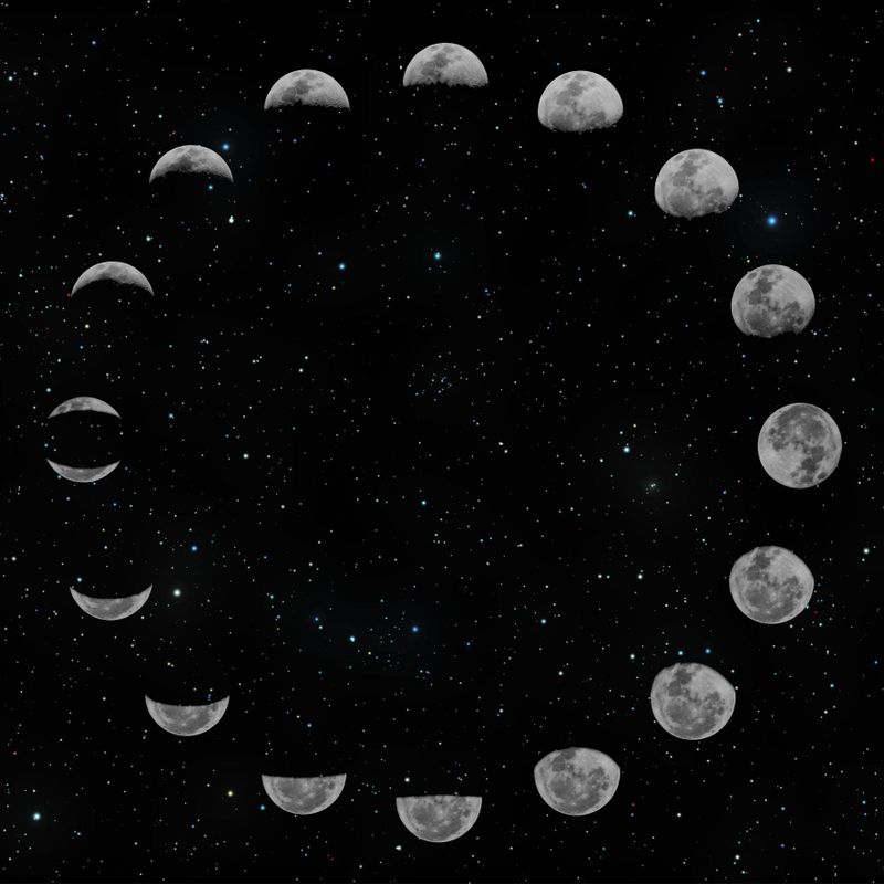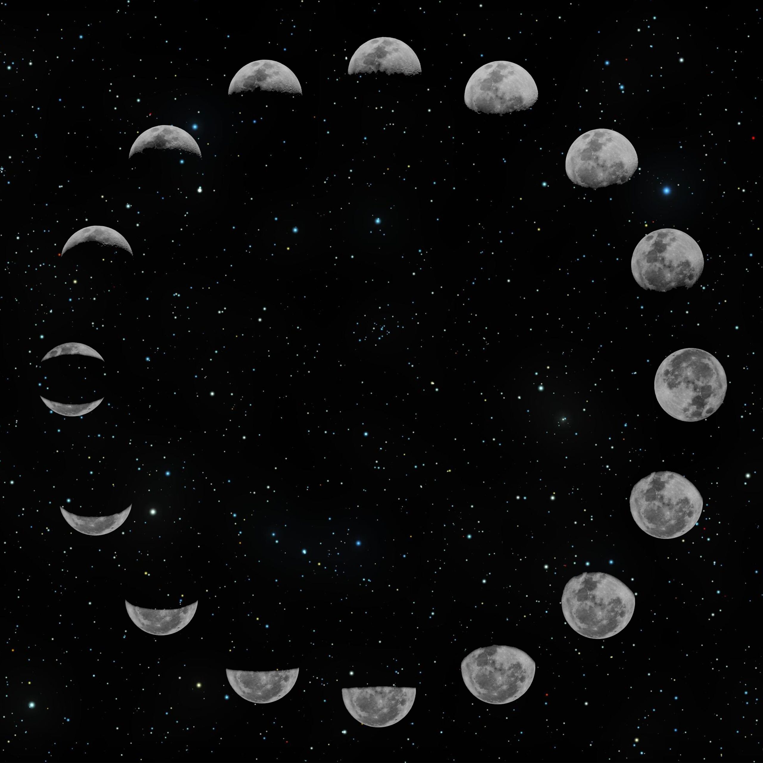 Cele patru faze ciclice ale Lunii sunt: Lună Nouă, Primul Pătrar, Lună Plină și Ultimul Pătrar.