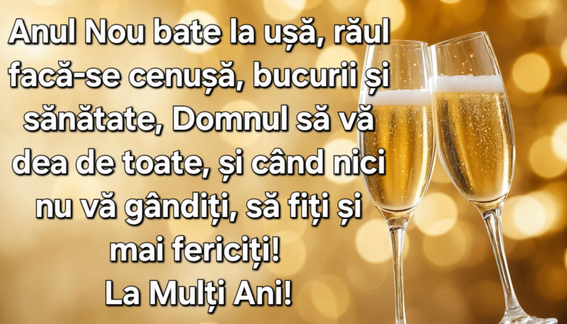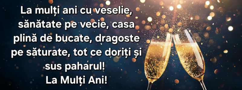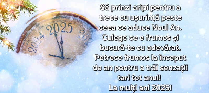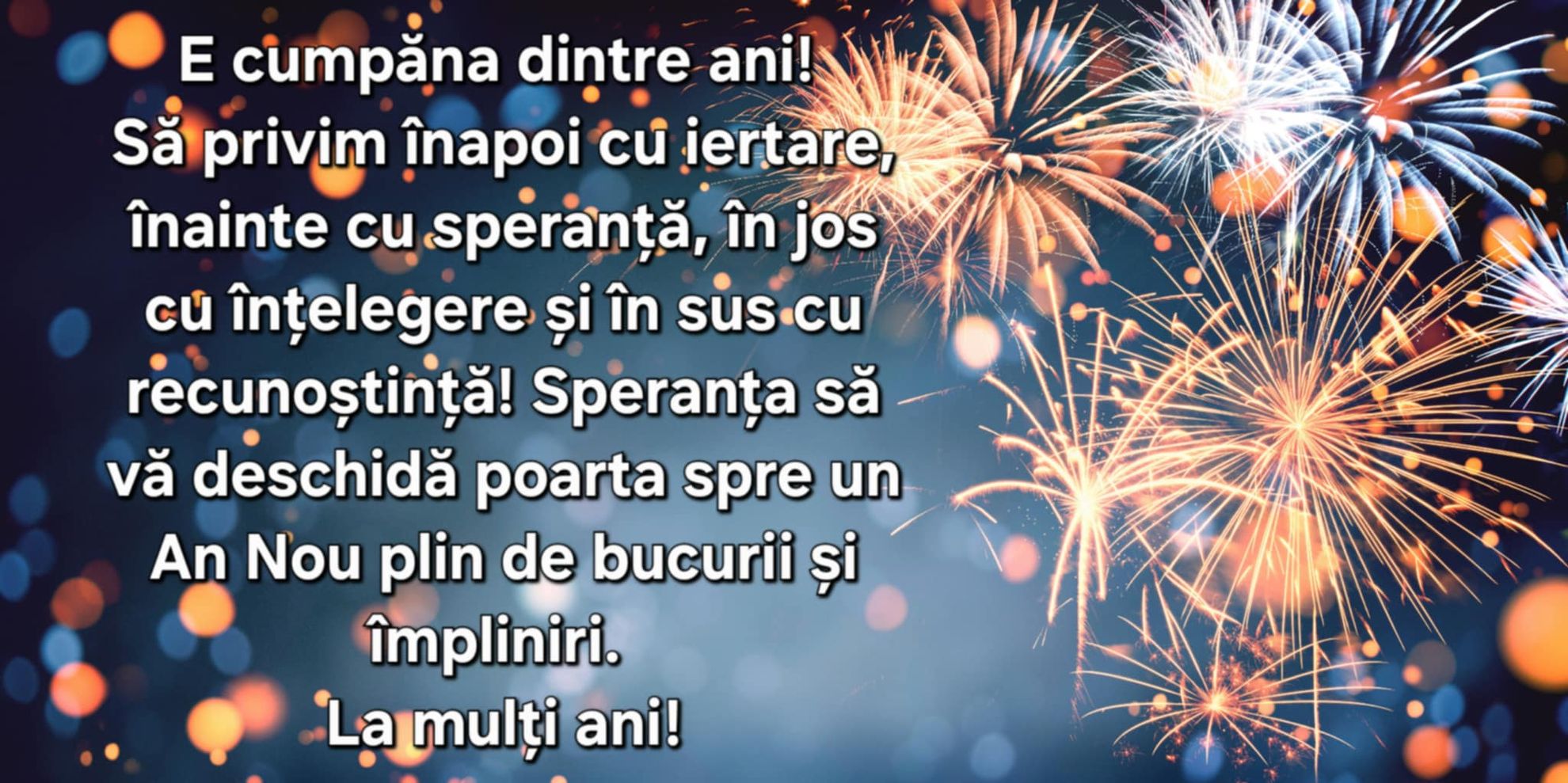 Cu ocazia trecerii în Noul An, vă doresc să vă împliniți fiecare vis și să vă bucurați de fiecare reușită. La Revelion, să strălucim împreună în lumina speranței. La mulți ani cu optimism și încântare!