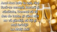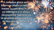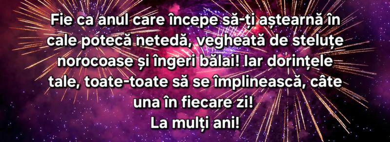 Lăsaţi o parte din lumina artificiilor aprinse în noaptea anului Nou să vă lumineze. Fie ca anul care vine să fie pentru voi o punte spre ceva mai bun, mai luminos. Tot ce vă este de folos să se realizeze şi nimic să nu vă înnoureze „cerul” senin al vieţii! Anul Nou să vă dăruiască sănătate, pace în suflet şi prosperitate.