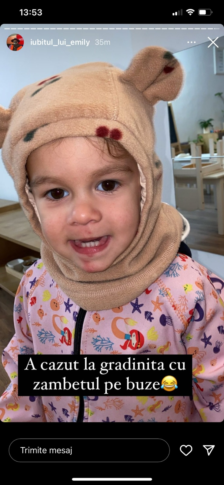Iubitul lui Emily le-a arătat admiratorilor lor cum arată micuța Amedea după căzătura de care a avut parte la grădiniță. Ușor lovită în zona gurii, tânărul tătic a făcut haz de necaz de situația în care s-a aflat fiica lui, la o zi de la botezul frățiorului ei.