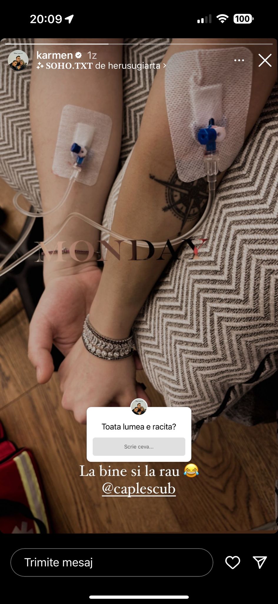 Se pare că din cauza unei răceli, Karmen și soțul ei au ajuns la perfuzii, iar aceasta a postat o imagine care indica acest lucru pe internet, în dreptul căreia a scris și: „La bine și la rău”. Ba mai mult, vedeta a fost curioasă să afle câți dintre urmăritorii ei trec prin astfel de probleme în această perioadă, adresând o întrebare online fanilor.