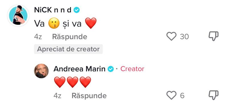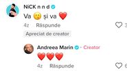 Nick a văzut videoclipul, care are mii de aprecieri și comentarii și a reacționat și el, public, în văzul tuturor. A scris în secțiunea de comentarii „Vă pup și vă iubesc”, semn că este total de acord cu relația lor. Andreea i-a răspuns imediat cu inimioare, așa că e clar că nu există nicio problemă, iar Nick își susține fiica în cuplul pe care îl formează.