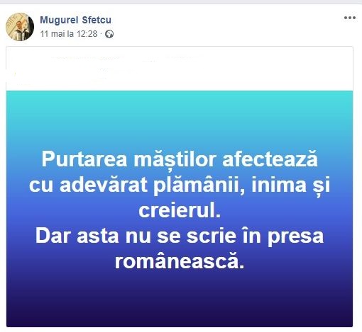 Mugurel Sfetcu, care este acordeonist, nu e de acord cu măștile, distribuind recent un mesaj care circulă pe internet: „Purtarea măștilor afectează cu adevărat plămânii, nima și creierul. Dar asta nu se scrie în presa românească.”